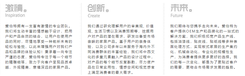 愛伯特家居有限公司屬中外合資企業(yè),成立于2007年,坐落于福建漳州北斗工業(yè)園區(qū),占地66000平方米。對于板式家具,木質(zhì)家居產(chǎn)品,我們專業(yè)的團(tuán)隊(duì)有著世界頂級的生產(chǎn)能力,產(chǎn)品原料及品質(zhì)要求符合國際各類管理體系的標(biāo)準(zhǔn)。愛伯特自創(chuàng)始之日起至今,始終保持超乎尋常的成長速度。我們與(HomeDepot,Lowes,Aldi,Lidl